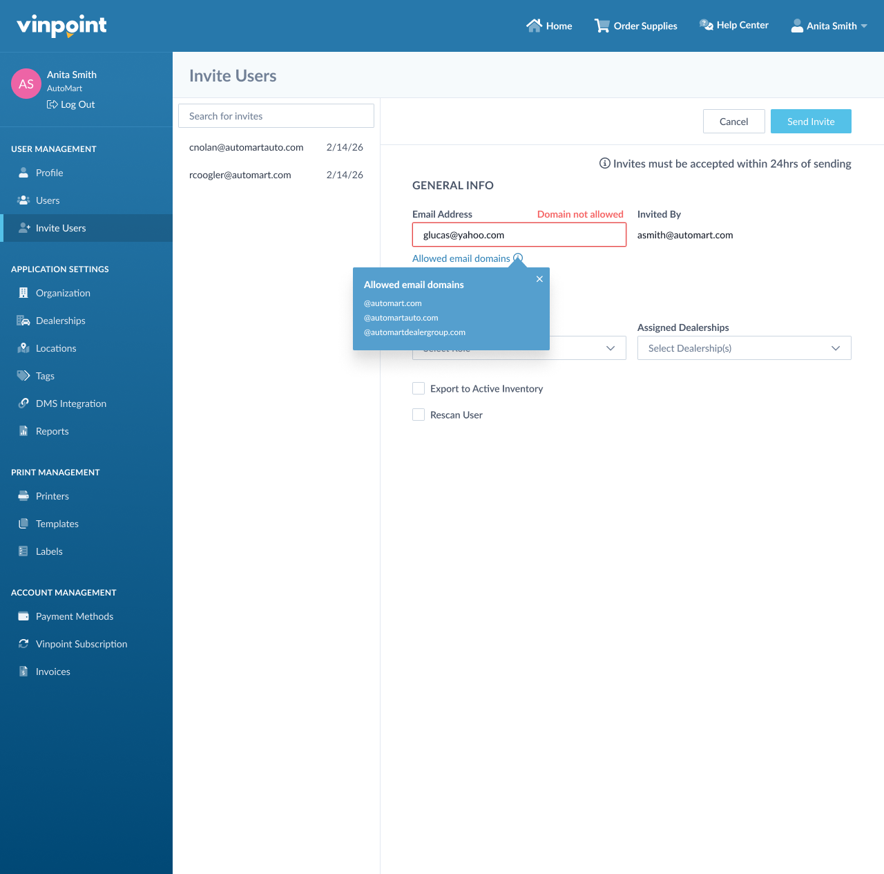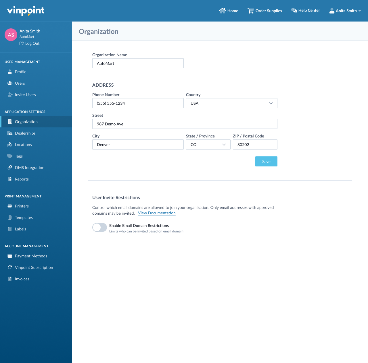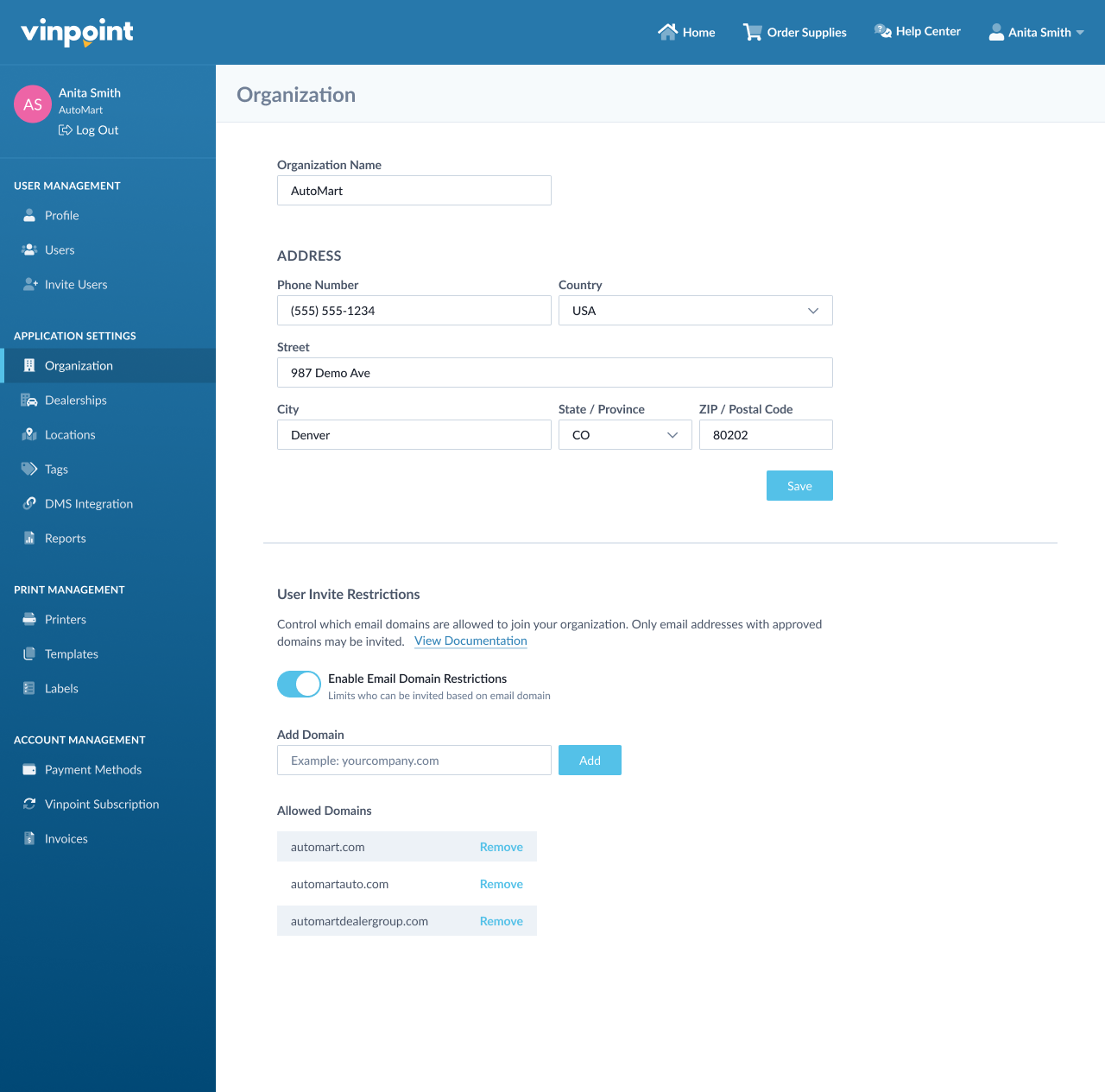 Note: If your organization uses Vinpoint's SSO (Single Sign-On) feature, you cannot manually enable or manage email domain restrictions from the organization page. Please contact CPH Support to enable or modify email domain restrictions for SSO-enabled organizations.