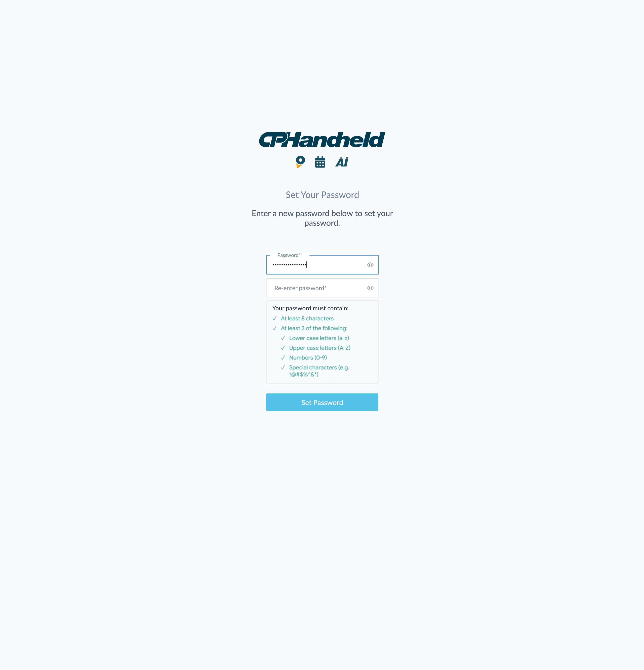 Next, create your password by entering it in both the "Password" and "Re-enter password" fields, ensuring it meets the requirements, then click Set Password to complete your account setup.