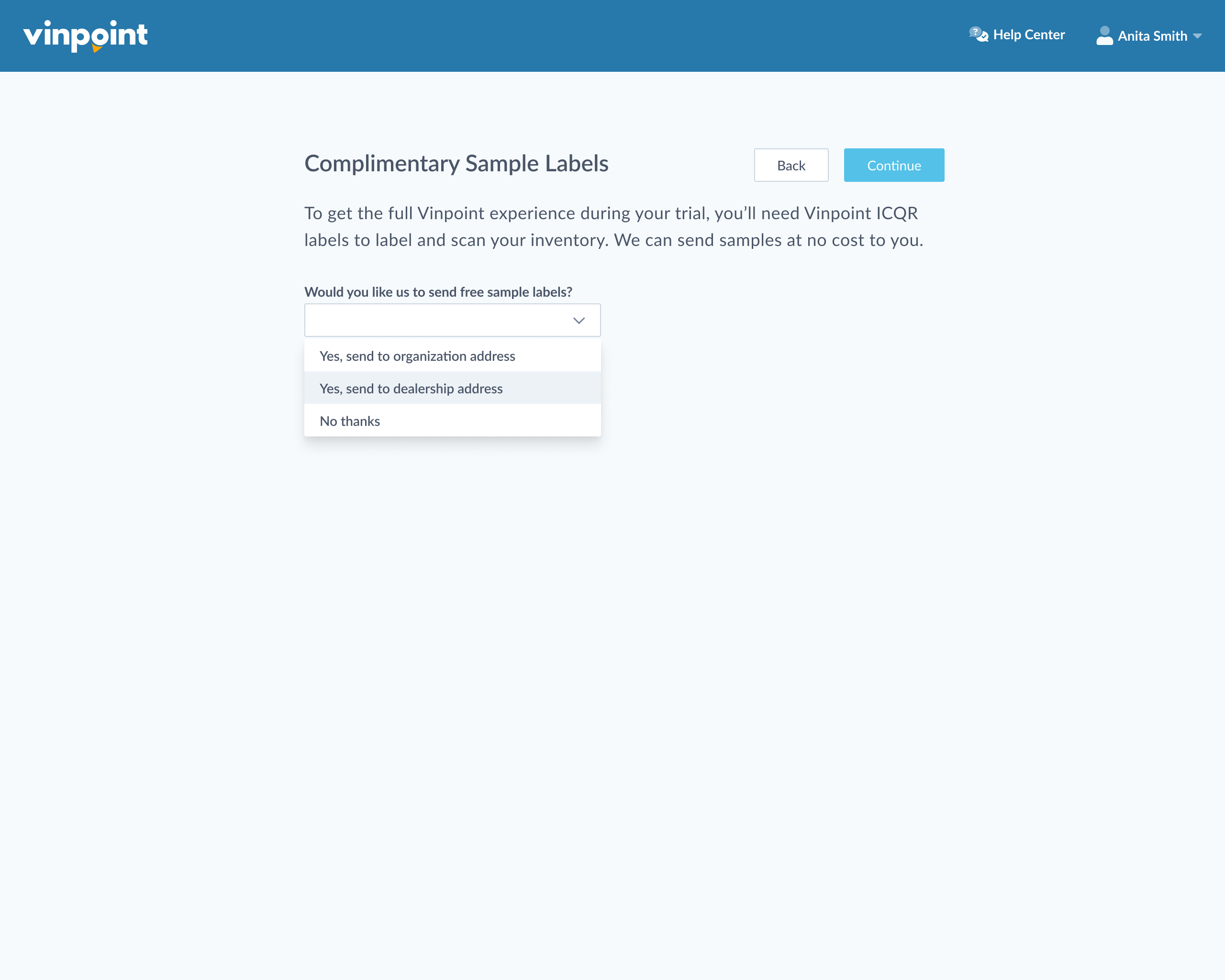In order to get the most out of your free trial, we'd like to send you some Vinpoint ICQR labels so you can label and scan your inventory. If you'd like us to send you free labels, select "Yes, send to organization address," or "Yes, send to dealership address" and click Continue. You will receive an email confirmation that we're sending you ICQR sample labels.