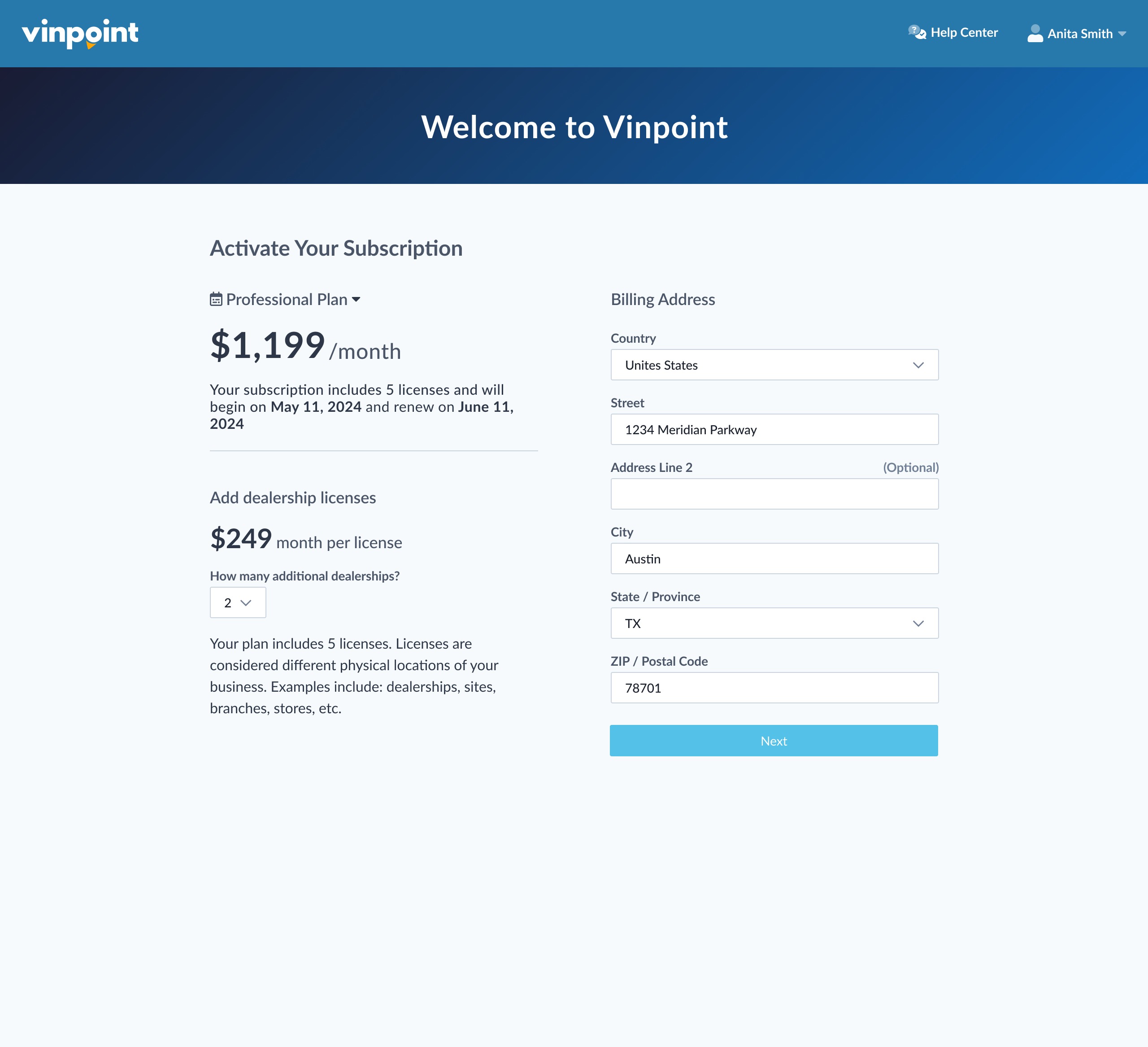 You can optionally add dealership licenses at this point if you need more than are included in your plan. For each physical location (dealerships, sites, branches, stores, etc.) you will need an additional license to add them to your organization.