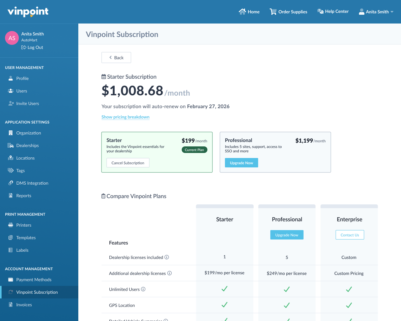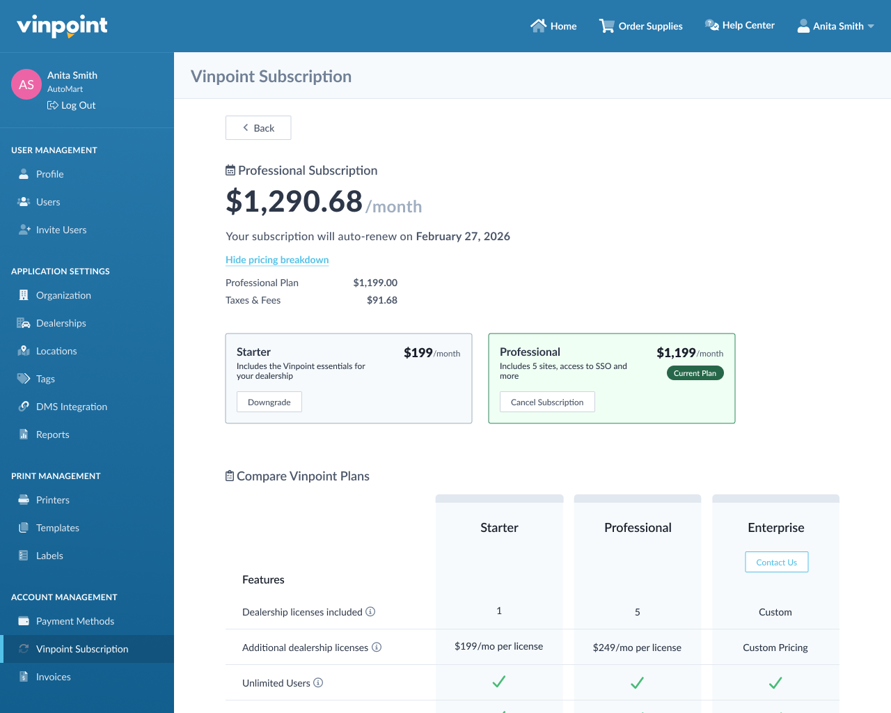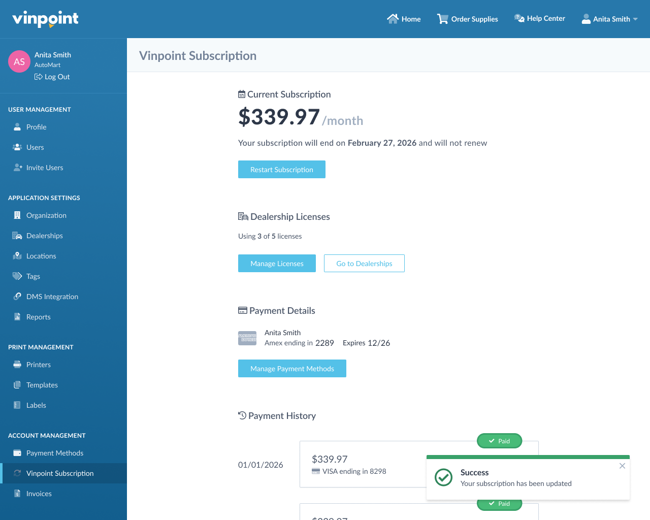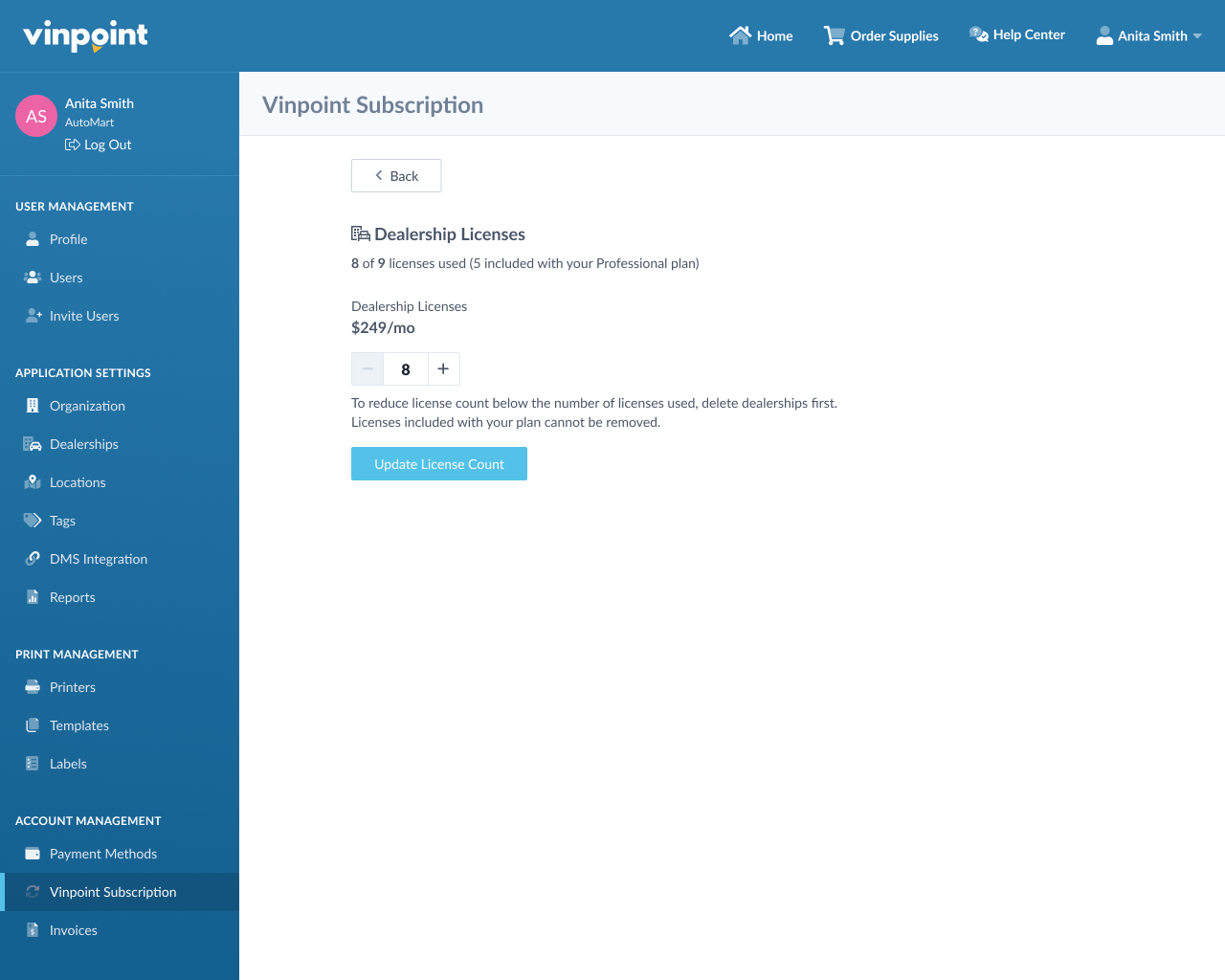 To manage your dealership licenses, click on your account name in the top right corner and select Subscription from the dropdown menu.