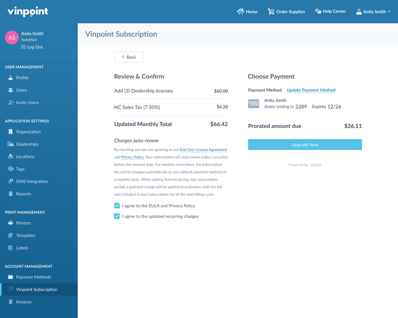 Review the charges and click Upgrade Now to complete the purchase. You'll be charged immediately for the prorated amount, and your new monthly rate will apply starting with your next billing cycle.
