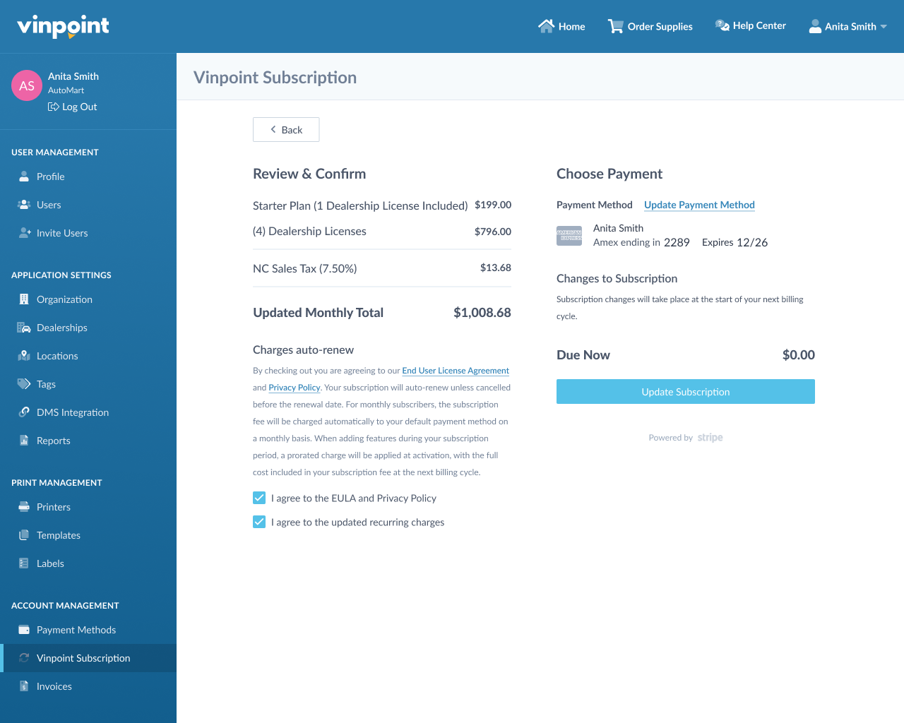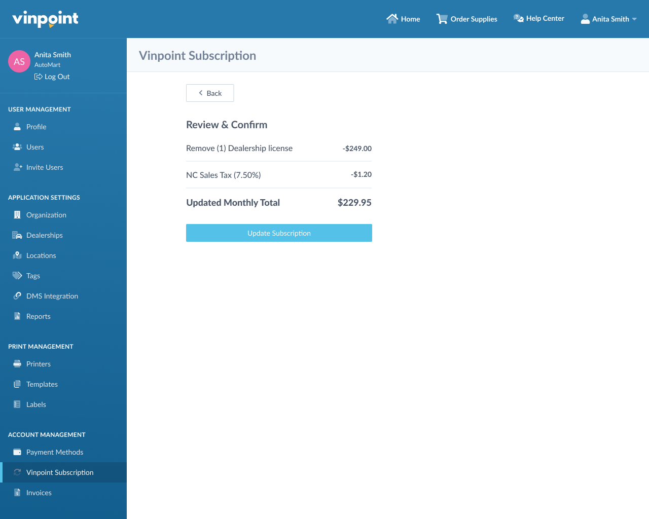 Review the changes and click Update Subscription to confirm. Your new monthly rate will apply starting with your next billing cycle.