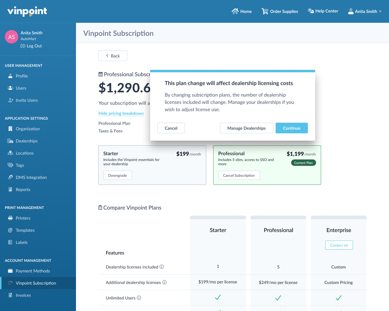 If you have more than 1 dealership license, you'll see a message that the plan change will affect your dealership licensing costs. You have three options:
