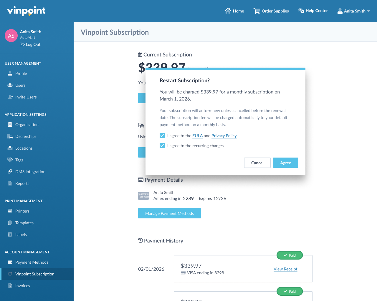 Check both boxes to agree to the EULA and Privacy Policy and to confirm the recurring charges. Then click Agree to restart your subscription.